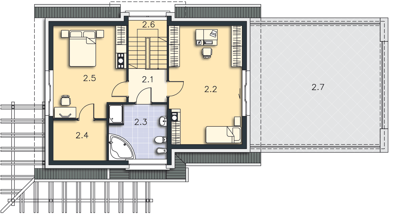 - na poddaszu zamienić pom. 2.5+2.6 z pom. 2.3+2.4