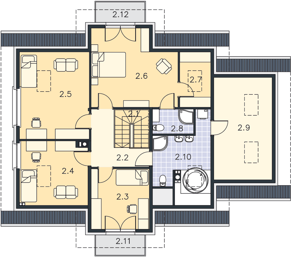 Myślę,że lepszym rozwiązaniem jest przeniesienie schodów w miejsce łazienki 1.9 mamy wtedy lepszy dostęp do pomieszczeń na piętrze i do pomieszczenia 2.9 pod schodami można zrobić przejście do pom. gospodarczego