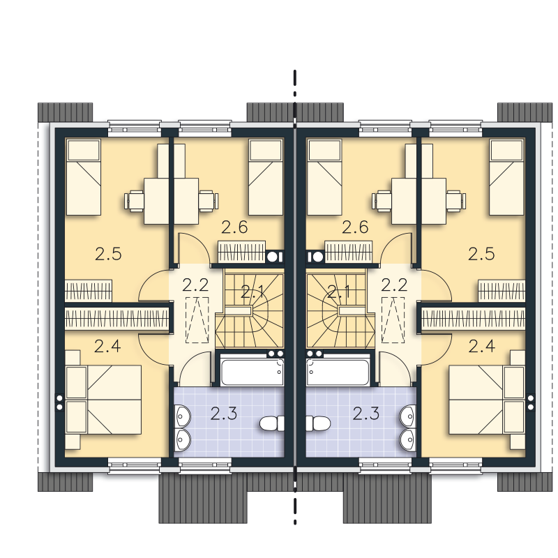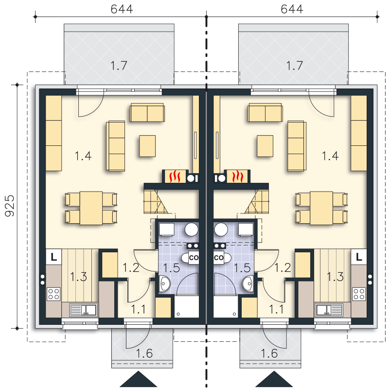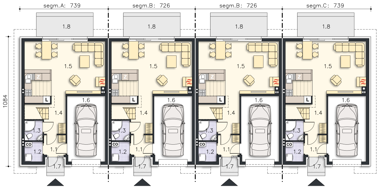 Jest to szeregówka. Cena projektu to 2090 zł za segment. Szacunkowa wycena budowy do stanu developerskiego od 218 100 zł
