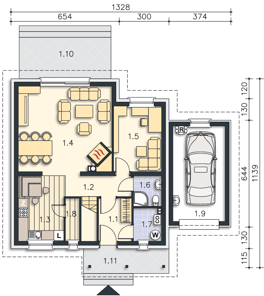 Jeżeli ten projekt Panu odpowiada, a nie będzie można ustawić go bokiem to można w wersji lustrzane odbicie zamienić 1.1 z 1.6 i wówczas zrobić wejście na ścianie szczytowej. Przeszklenia będą od południa. Zmiany możemy wprowadzić u nas w biurze. Prosimy o kontakt mailowy.