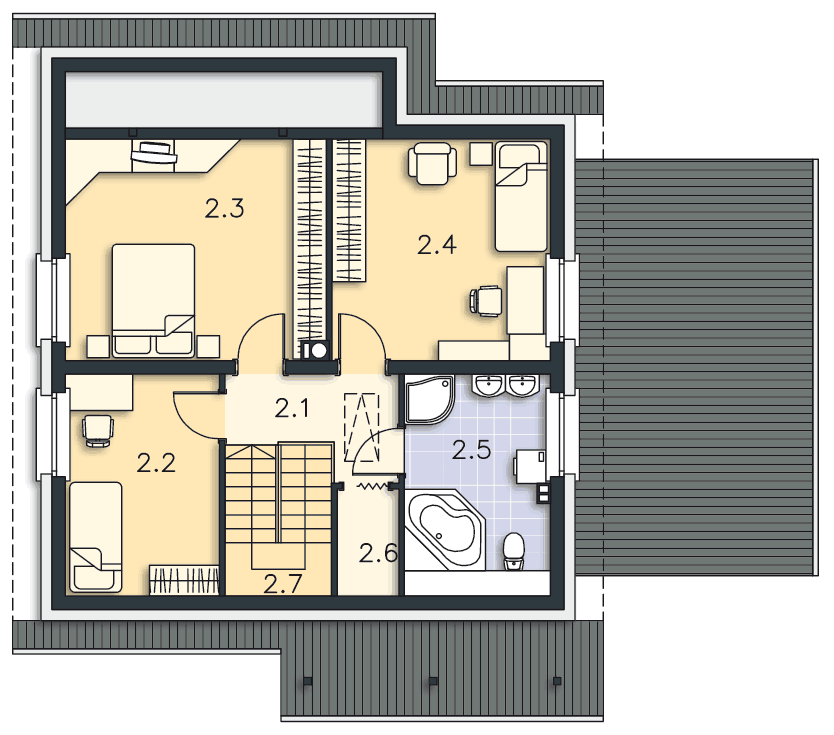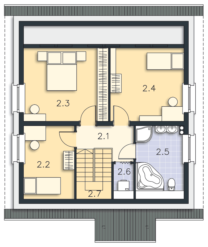 Na piętrze - w pokojach 2,2 i 2,3 okna balkonowe, w 2,3 i 2,4 dodałem okna połaciowe, schowek 2,6 wydłuzony do końca schodów natomiast w łazience wejście jest na wysokości prysznica, okno w łazience zminiejszone.