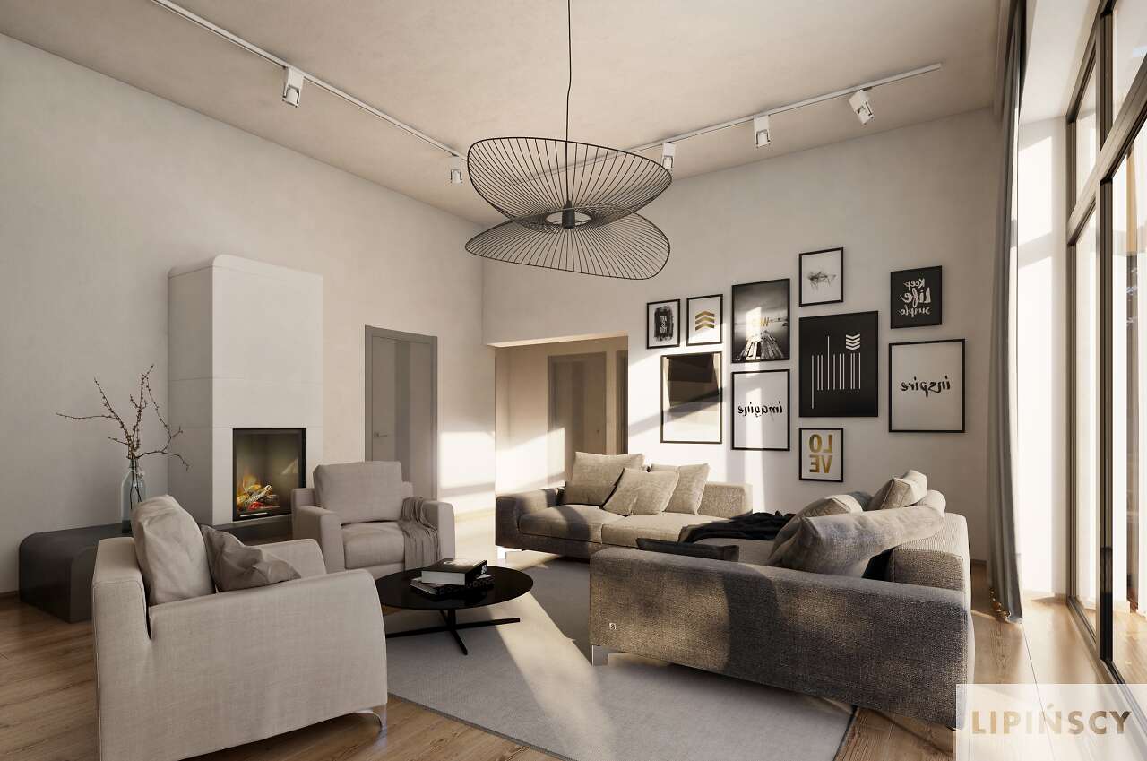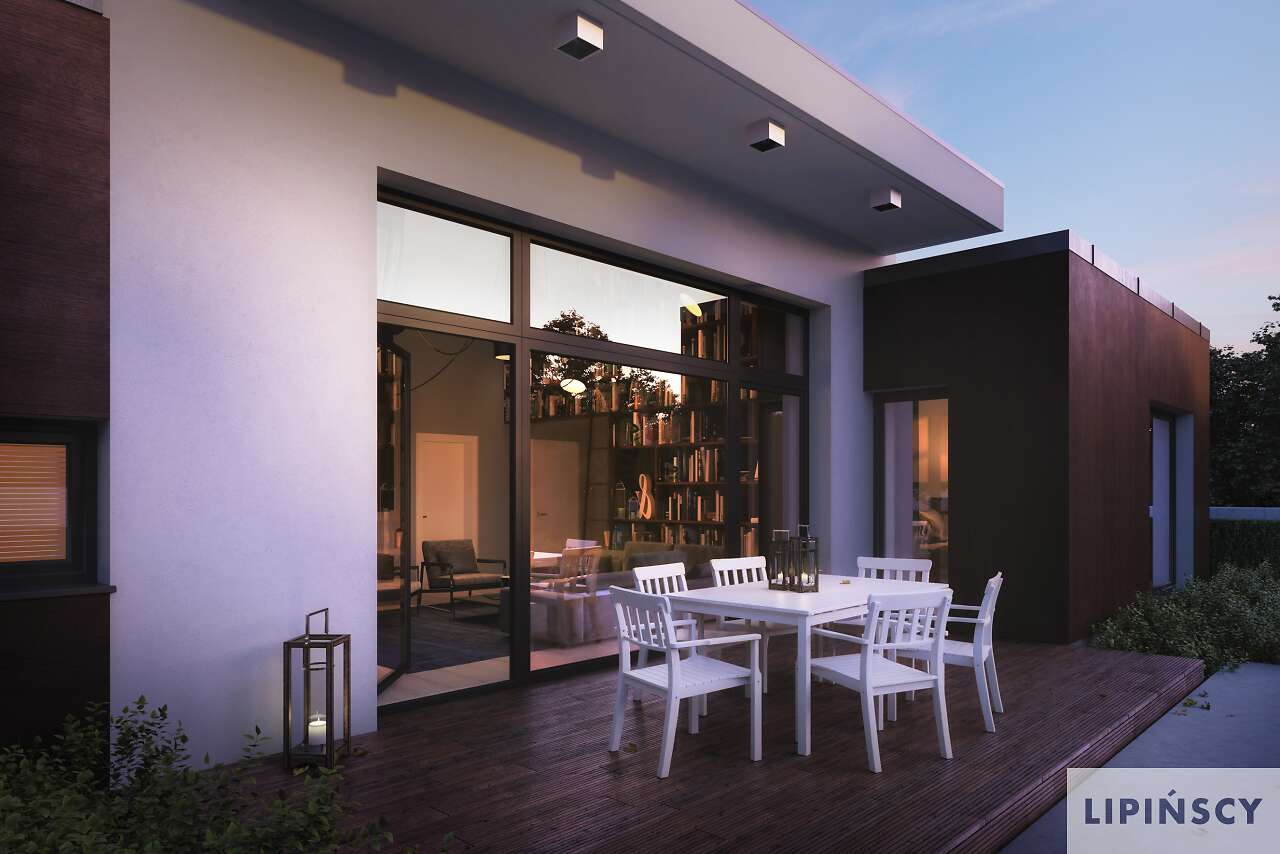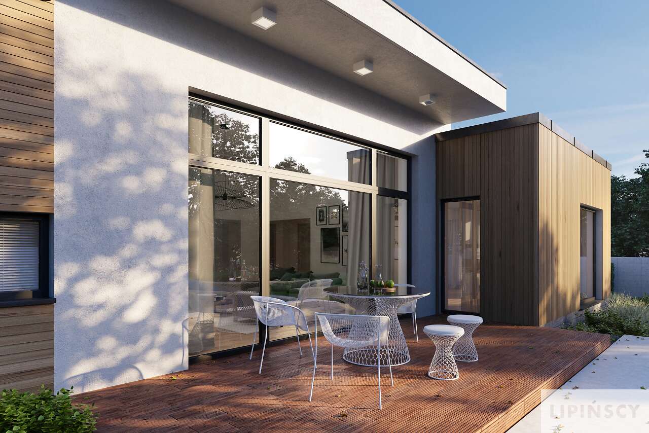 Projekt bardzo ciekawy, szczególnie wysokie pomieszczenie salonu prezentuje się imponująco. Okna też wydają się wyższe niż standardowe, raczej aluminiowe niż pcv? Część okien jest chyba nieotwieralnych. Czy można zastosować drzwi przesuwne do wyjścia na taras? Czy w projekcie podane jest jakiej firmy są okna?