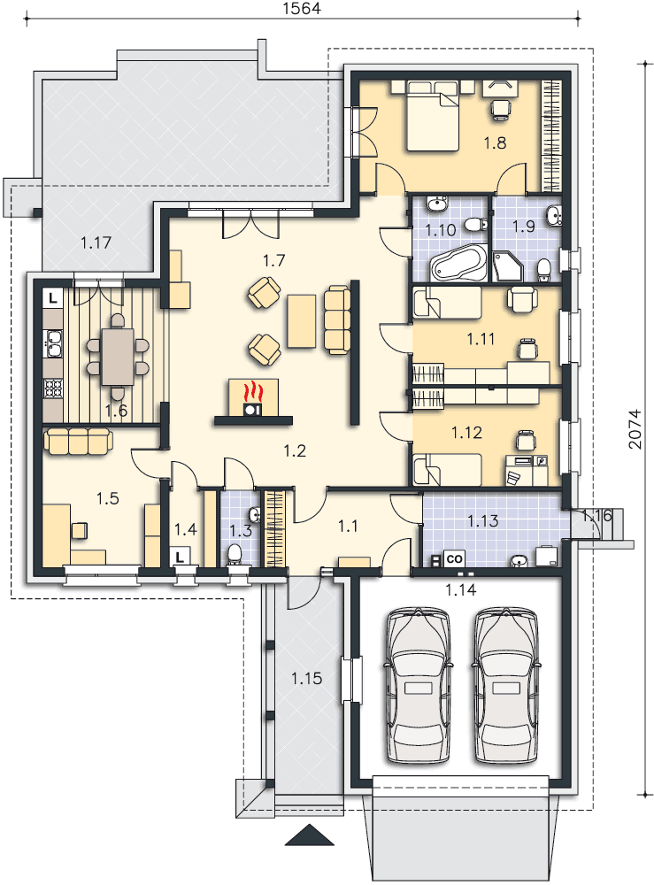 1. wyprostowanie ściany zewnętrznej między pokojami 1.6 i 1.7 zmniejszy taras, ale pozwoli przesunąć spiżarnię i umiejscowić ją między kuchnią, a pokojem 1.6 z przejściem z kuchni