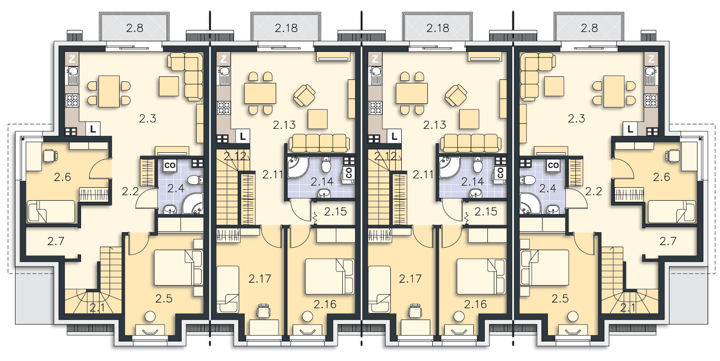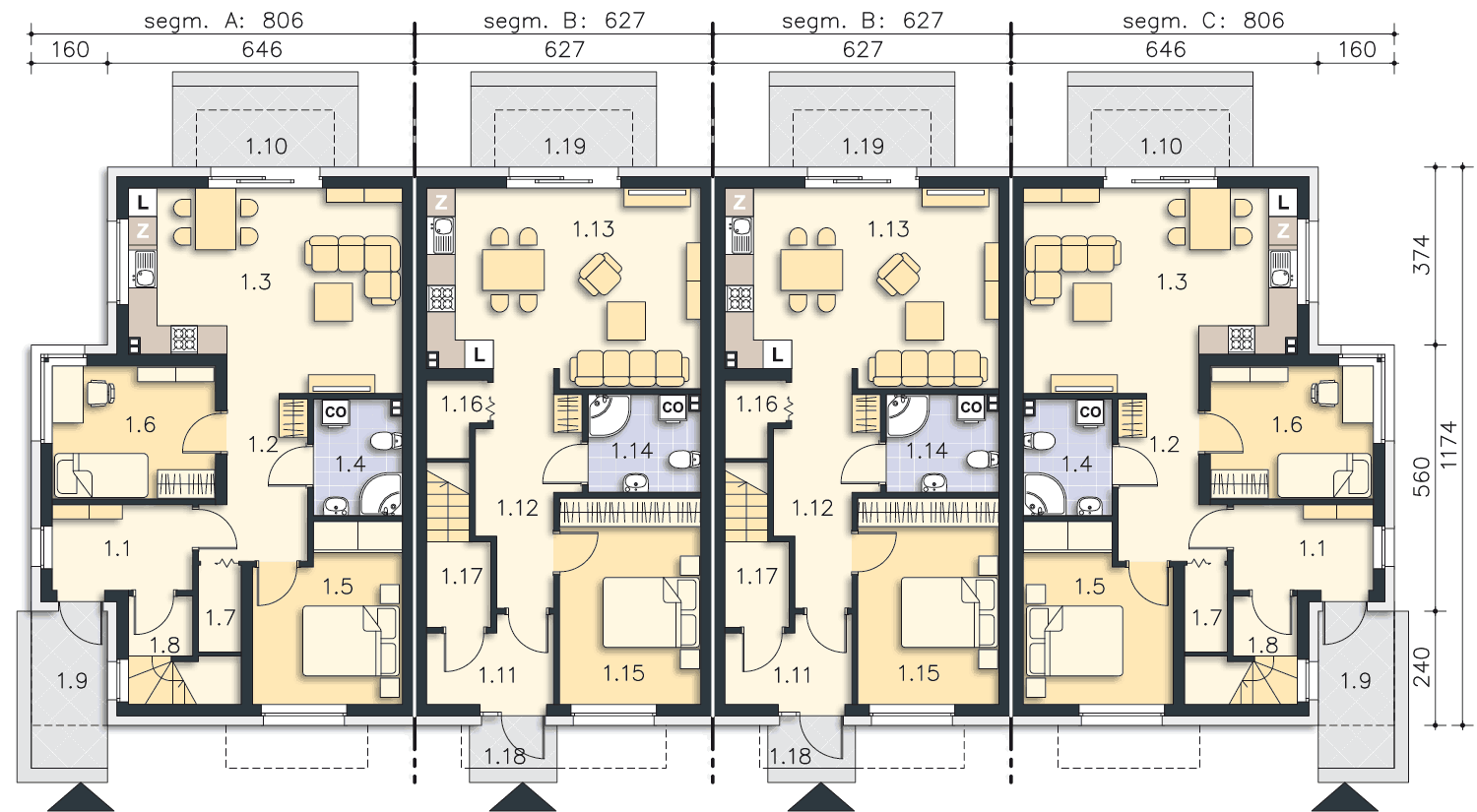 Segmenty skrajne A i C - 125, 59 mkw. Są to segmenty jak w bliźniaku Zurych III.